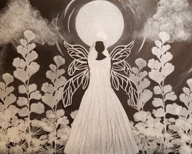 VISUALIZE THIS: You are walking down a path through a fragrant flower garden on a summer night. You see the flashing lights of the fire flies. You see the far away light from our sun reflecting off of the planets & moons in our solar system. You see the other mysterious stars within our galaxy & galaxies beyond ours in the vast universe shining above you. You see Earth's moon reflecting the full glow of our solar system's sun, casting light, creating shadows & reflections. The heavily scented beds of blooms are absorbing the light of the moon causing them to glow & sparkle.The flowers look as if they have been painted with with phosphorescent paint and sprinkled with a fine powder of twinkling iridescent glitter. A rainbow halo appears around the massive super moon. A misty cooling fog slowly creeps in, curling its way around everything including you. It coats all it touches with a thick dew. The condensation becomes so heavy, it drips down the plant's petals & leaves. The reflection of the Moonlight creates a sparkling, dew drop diamond mine. Glistening gorgeousness surrounds you.You look on, gasping in disbelief as the bees, moths, butterflies, dragonflies, fireflies & hummingbirds transform into pixies & fairies flying all around you. They sip the dewy nectar from the flowers. It cools & refreshes them, quenching their thirst. Ghosts of sentient beings float amongst the fairies, haunting the garden paths. They seem to be enjoying this blissfully surreal sight right along with you. A fairy flutters close, then whispers in your ear, "they are your guardians, the spirits of lost loved ones, do not fear them, they mean you no harm."Suddenly mushrooms & toadstools begin magically rising up from the Earth. Expanding & unfurling to serve as tables & chairs for the fairies. Providing them a place to rest, play & create. Their own miniature art studio. They happily work together tediously & carefully choosing blossoms & greenery for their creations. Just before the rise of the light the fairies present you with a glorious crown of flowers they created especially for you. Flying around the crown they lift it and place it upon your head. They thank you for creating, planting & caring for such a beautiful flower garden fueling station for all of the pollinators. Especially the monarch butterflies on their way south at this time. As soon as the dawn begins to colorfully light the atmosphere they change back into bees, moths, butterflies, dragonflies & hummingbirds & the guardian spirits can no longer be seen. You are so thankful for a new day & more time to live, you whistle along with the cardinal birds that are announcing the beginning of a brand new day.